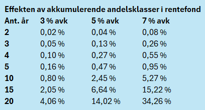 Eksempel: Setter du inn 1 mill kr i 3 år og får 5 % årlig avkastning i et rentefond og skattesatsen er 22 %, vil forskjellen mellom utsatt skatt i tre år versus årlig beskatning være 0,13 % prosent av startverdien, målt ved høyere saldo etter skatt. I kroner: 1.122.948 kr vs 1.121.622 kr, en forskjell på 1.325 kr. Dette høres lite ut, men er tidshorisonten lang og avkastningen god, vil det dreie seg om betydelige beløp.